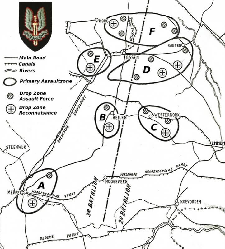 The men from the 3e and 2e Régiment de Chasseurs Parachutistes, are to be dropped across Drenthe, broadly along the axis between Zwolle and Groningen. Eighteen armoured jeeps, equipped with machine guns and intended to provide mobility and shock effect against the enemy, are to be dropped with them.