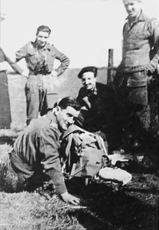 The Gayard stick experiences difficulty regrouping after the drop. Two men are missing and one, Private Maurice Legay, breaks his ankle on landing. His comrades leave him concealed in a haystack and alert a nearby farmer. The farmer recognises that the injury requires medical attention. He dresses Legay in civilian clothing and takes him by bicycle to a doctor in the nearby village of Ruinen. While the doctor treats the ankle, two German soldiers arrive at the surgery, slightly wounded in a skirmish elsewhere in the village, and demand treatment. Legay sits in the same room, hidden behind a folding screen with his Colt .45 ready. The German soldiers notice nothing and are seen off by the doctor. The doctor then completes the treatment of Legay’s ankle. The farmer accompanies Legay back to the farm, where he remains in hiding until Canadian ground forces arrive.