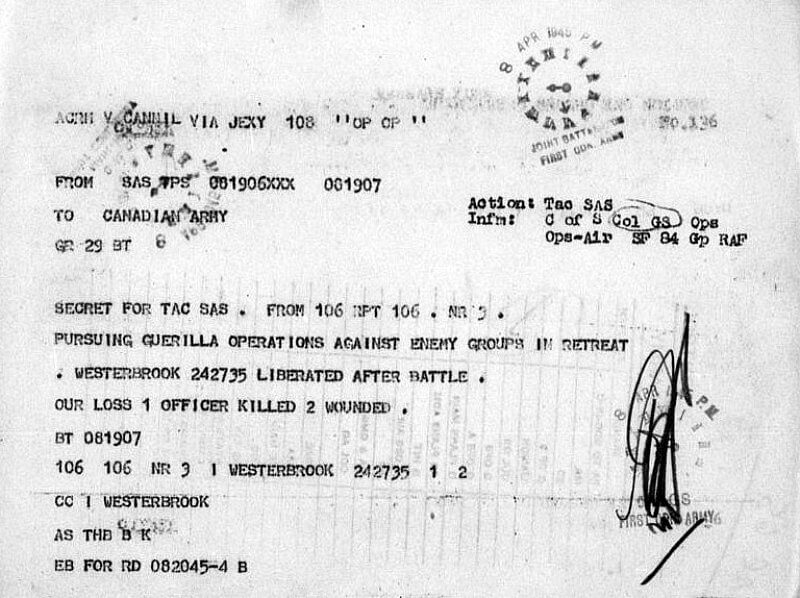 On April 10th, 1945, at 09:30, Puech-Samson reports to main Special Air Service Headquarters that he can hear what appear to be Allied tanks on the road between Zweelo and Wezeperbrug. Shortly afterwards, elements of the Polish Armoured Division reach Puech-Samson and his men at Witteveen.