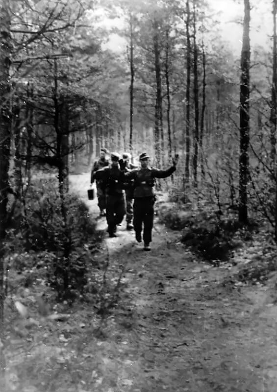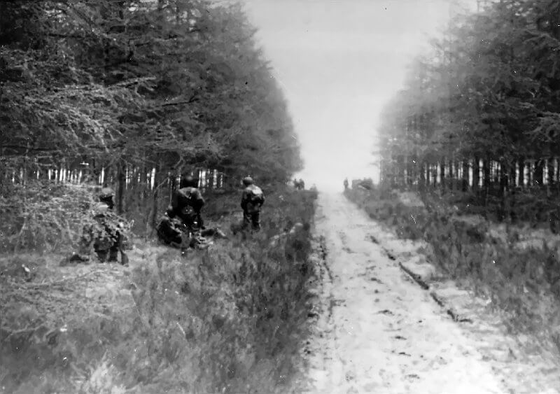 In the early hours of April 8th, 1945, French paratroopers are seen moving through Schoonloo along the main road, most likely members of the Corta stick. Frederik Klaassens, 57, who runs the local café, and his son Jantinus Klaassens, 23, go out to greet the paratroopers and offer them coffee. A German soldier passing on a bicycle is taken prisoner. The paratroopers move north along the road to a farm outside the village called De Strubben, where a brief skirmish kills two German soldiers travelling on a motorcycle combination. Within an hour a strong detachment of Feldgendarmerie, approximately fifty men, arrives at Grolloo and fans out toward Schoonloo to search the forests for the paratroopers, using tracking dogs. The search finds no one, partly because the Germans are reluctant to probe deep into the forest. The French have been forced to abandon most of their equipment in their haste to escape. Rucksacks, ammunition, and food supplies fall into enemy hands.