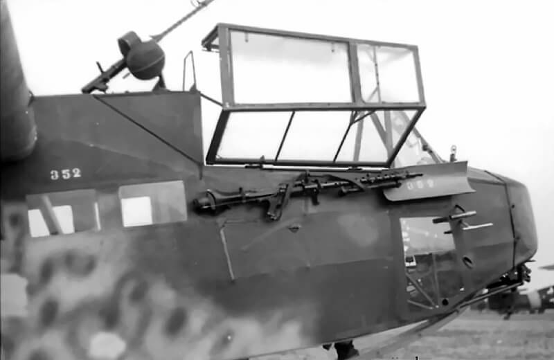 Armament is minimal and intended only for immediate self-defence. Early DFS 230 variants carry no weapons. Combat experience leads to the installation of a 7.92 millimetre machine gun on many aircraft. This is typically an MG 34 or MG 15. The weapon is mounted on a swivel at the starboard side of the cockpit or roof. A troop member operates it during the final approach. Fire is directed forward through a narrow opening. Accuracy is limited. Its primary function is suppressive fire during landing. Some later aircraft are fitted with twin forward-firing MG 34 machine guns mounted on the fuselage sides. These fixed guns prove unpopular due to recoil and poor accuracy.