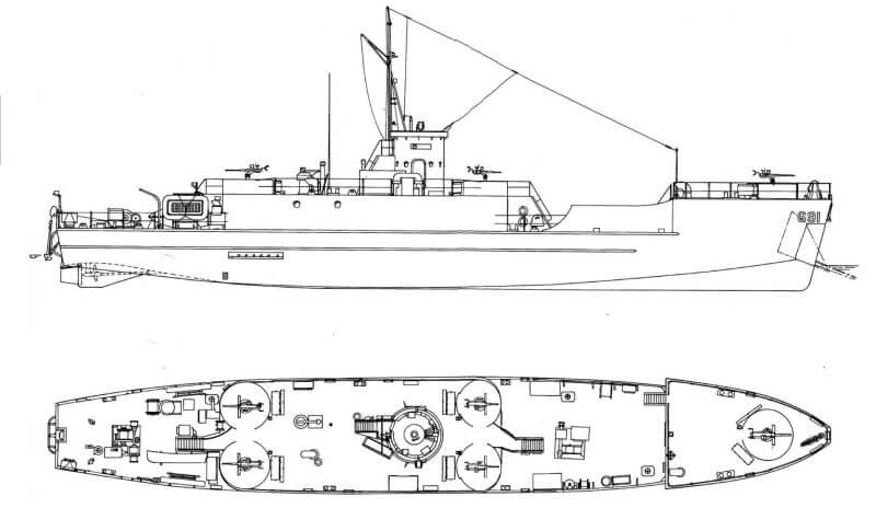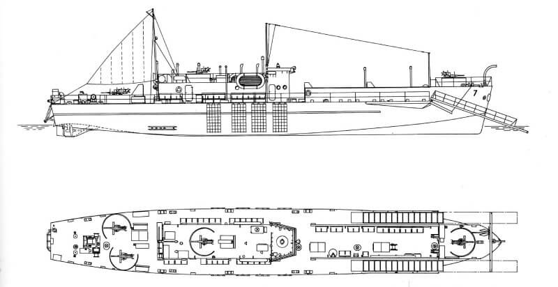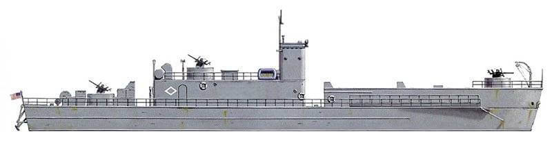Thirty-two Landing Craft Infantry, Large vessels are converted to AMCU-7 class coastal minesweepers. Some vessels serve as Underwater Demolition Team support ships, informally designated LCI(D). Hull LCI-346 is used as a press boat at Iwo Jima, collecting reporters’ dispatches for relay to the communications ship. Additionally, 130 Landing Craft Support, Large Mark 3 fire-support ships are newly built, not converted, on the Landing Craft Infantry hull. These are armed with one 76-millimetre 50-calibre gun, two twin 40-millimetre mounts, multiple 20-millimetre cannon, and ten Mark 7 rocket launchers.