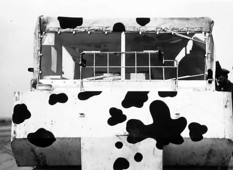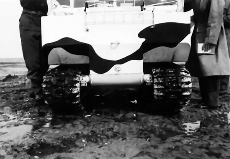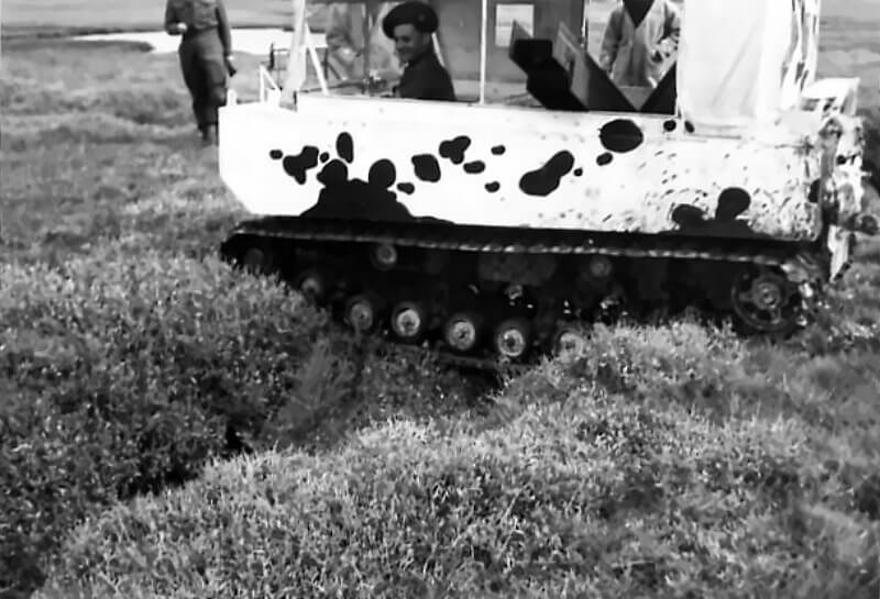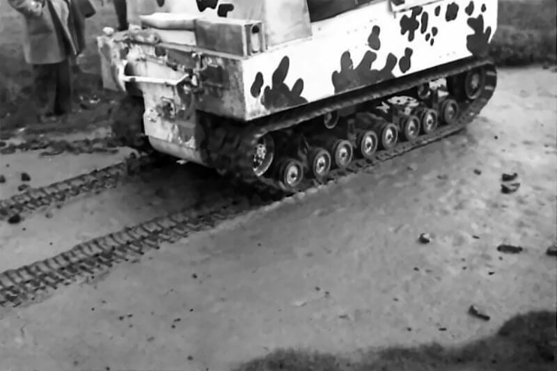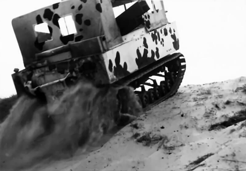 The British 79th Armoured Division test the M29 Weasel at their F Wing in Gheel, Belgium. The task of F Wing is to investigate new mine-clearing devices for specialised warfare. At least two systems are tested on the basic M29 Weasel. One is a lightweight mine-clearing plough. It resembles a scaled-down version of tank-mounted ploughs. The second system consists of clustered Centipede rollers. It carries the name Rodent. It is pushed ahead of the vehicle. It is designed to detonate German Schu anti-personnel mines. As far as records show, neither system enters active service.