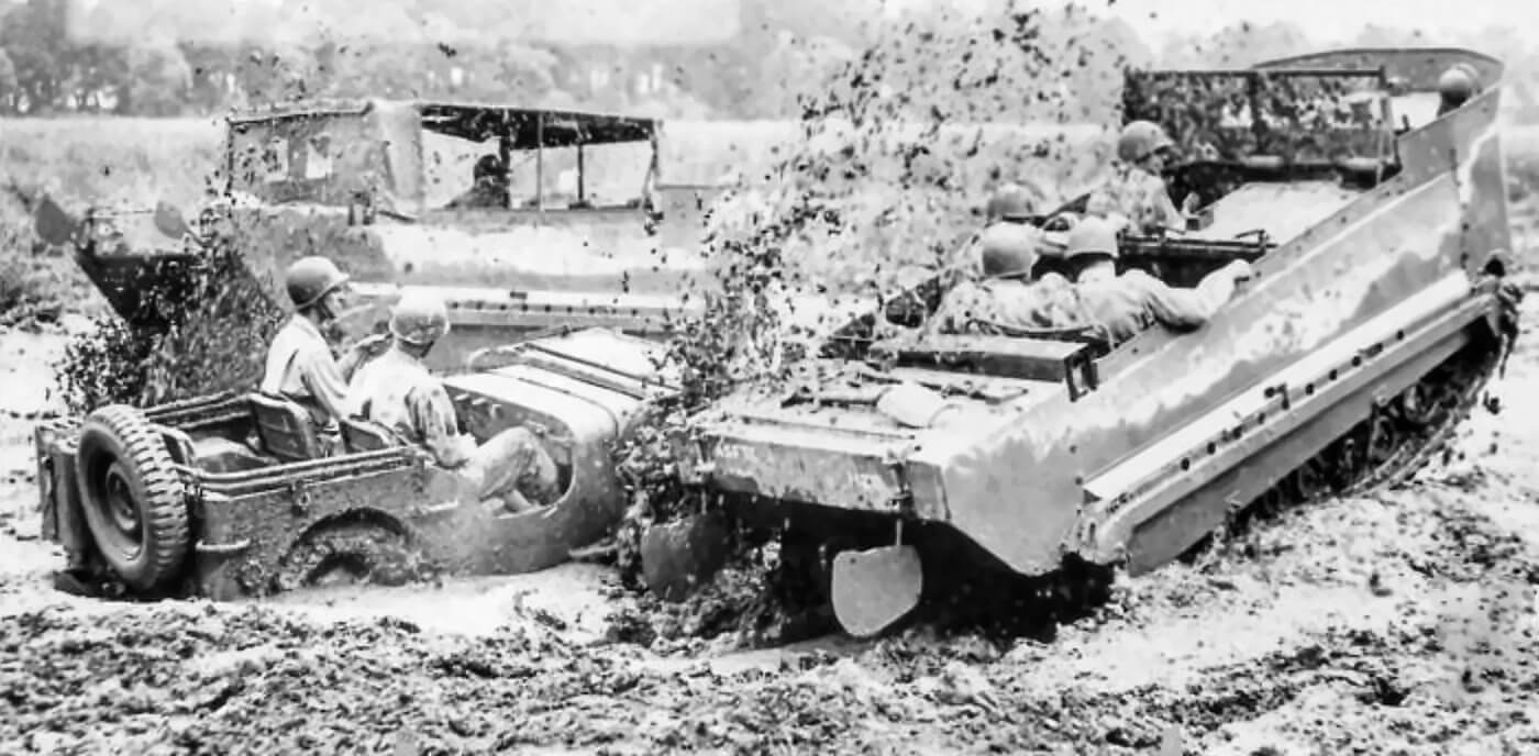 In Northwest Europe, Weasels take part in the Normandy landings on June 6th, 1944. They operate among the amphibious vehicle groups during the early assault phase. During the breakout from Normandy they haul ammunition to frontline infantry. They carry prisoners to the rear. After vehicle serial number 4104 they receive a stretcher kit. This allows evacuation of wounded from terrain inaccessible to jeeps. Engineers employ them to lay telephone cables using deck-mounted reel systems. Signal units use them as mobile radio platforms. The British 79th Armoured Division and Canadian formations make heavy use of Water Weasels in the flooded ground of the Scheldt Estuary in late 1944. In this campaign they operate alongside Alligators, DUKW’s, Buffaloes, and other amphibious vehicles. In deep mud and shallow water the Weasel remains one of the few reliable transport platforms.
